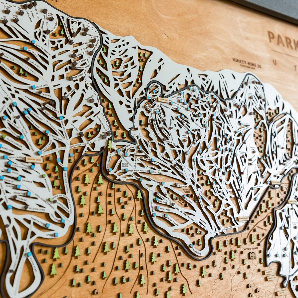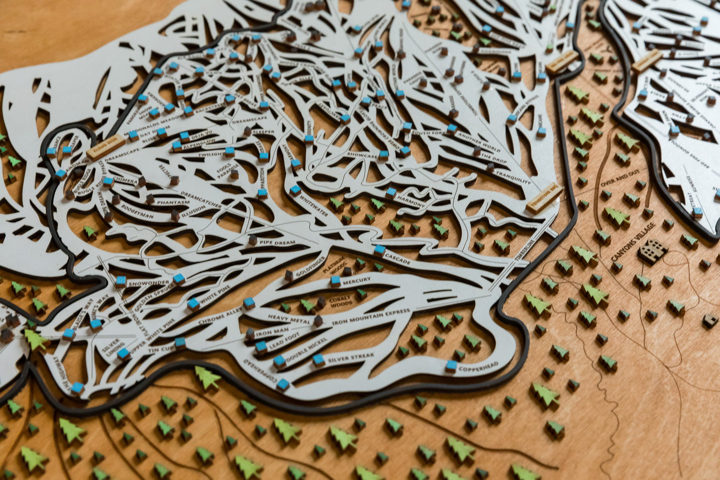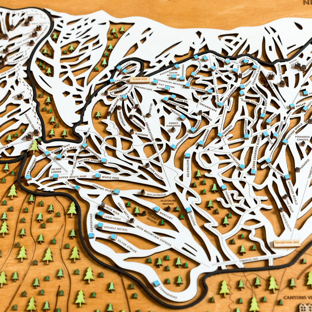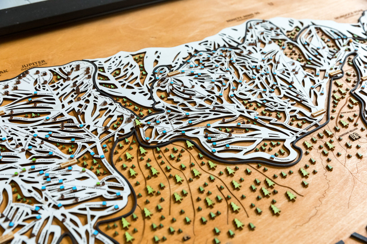 Every map is designed, hand drawn, and crafted inhouse with every piece being individually glued on one-by-one. In addition, all of our frames are made from scratch and are 100% wood. This is an official licensed Vail product which includes Park City's logo and trademarked features, making our products truly one of a kind.